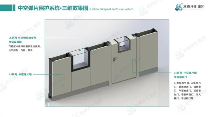 LS系列中空弹片围护系列产品,,,板材由特殊翻边彩钢板和12mm石膏板背贴组成,,板与板之间通过多种弹片配合H型竖龙骨、、C型竖龙骨、、、补强横料等进行组装,,,,并搭配LS系列门窗系统,,,,可满足各种类型洁净室需求。。。