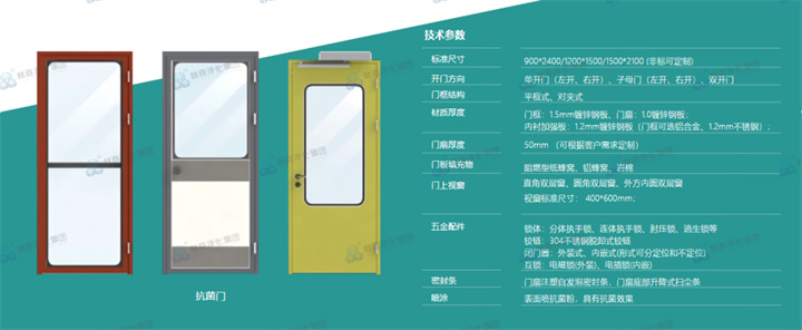 抗菌门采用镀锌钢板折弯、、焊接、、、复合而成,,,门扇三面采用发泡胶条密封,,底部采用自动升降式扫地条密封,,表面喷抗菌粉末有抗菌效果。。。
