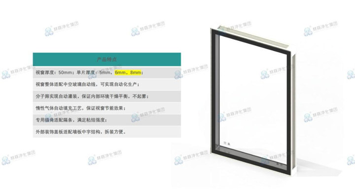 净化双层窗采用四边丝印钢化玻璃;窗内置干燥剂且充惰性气体,,,具有良好的密封性能;视窗与墙体齐平,,,安装灵活,,外观美观等特点;视窗厚度可根据墙体厚度制作。。